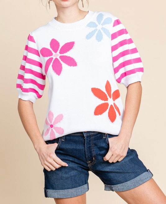 Mixed Print poet Sleeved Blouse U Neck and button back. Twinkle Detail and Point Stitch